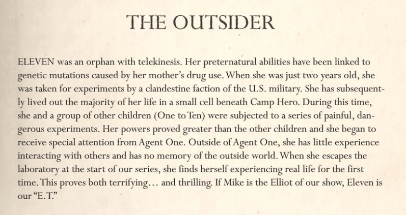One of the best series bibles that I have come across was created by The Duffer Brothers, co-creators of Stranger Things. A show that heavily revolves around 80s sci-fi, horror, and the nostalgic style of the decade becomes elevated as they paired images of iconic film moments to the characters that they were elaborating on. The inclusion of written bios along with related images bridges gaps for readers and gives a strong sense of the style of show you are creating. Here are a few pages from the Stranger Things (originally titled Montauk) series bible: